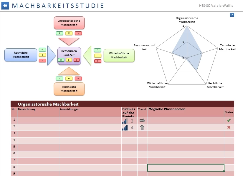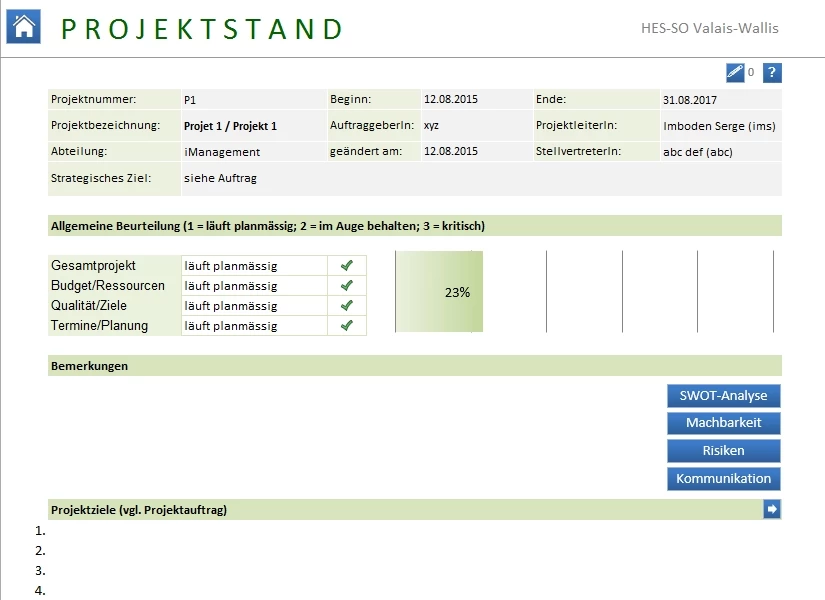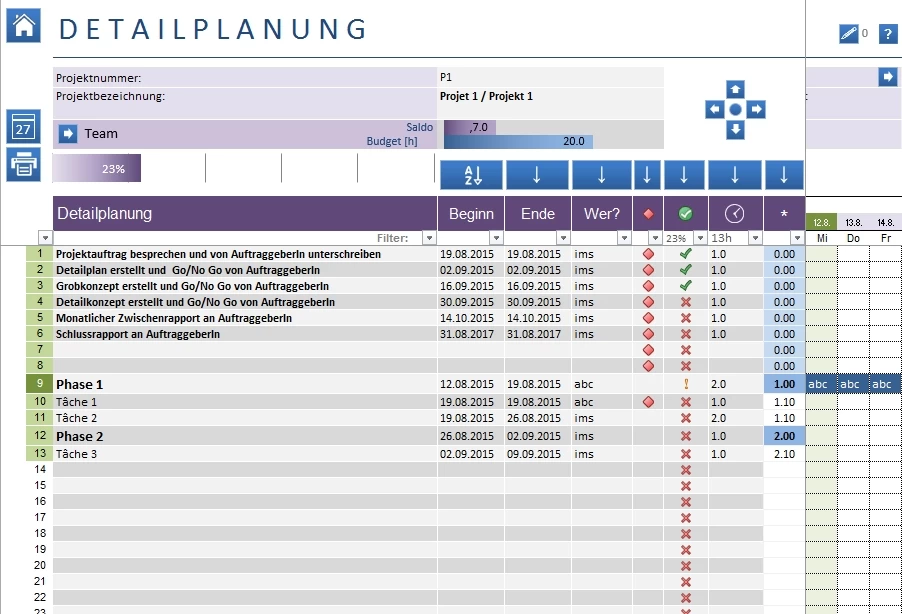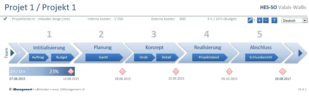 Dieses Projektmanagement Tool ist aufs Minimum reduziert und lässt Sie sowohl kleine, wie auch grössere Projekte professionnell leiten. Die fünf Phasen des Projekts - Intitialisierung, Planung, Konzept, Projektstandskontrolle, Schlussbericht - bauen aufeinander auf und helfen, den Überblick zu bewahren. Folgende Elemente sind in diesem Tool implementiert:
