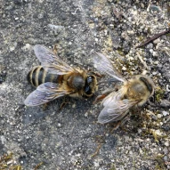Wo Räuberei ist, gibt es Räuberinnen und Beraubte. Eine schwache Beute, deren Wächterbienen ihren Eingang nicht wirksam verteidigen können, wird zum Opfer eines starken Volkes, das ihren Futtervorrat plündert … aber auch die möglicherweise zahlreichen Varroamilben, die den Immunrückgang nutzen, um sich zu vermehren und ihren Virenkatalog zu verbreiten! Die Räuberei ist also ein zweischneidiges Schwert. Der einzige wirkliche Nutznießer ist die phoretische Varroamilbe, die das Dach wechseln und sich trotz der zwei Sommerbehandlungen im gesamten Bienenstand ausbreiten kann! Eine beraubte Beute muss daher geschlossen und abseits des Bienenstandes verrückt werden, um die Räubersucht und die Übertragung von Krankheiten zu verhindern. Das Überleben dieses Volkes ist bereits vor der Einwinterung ungewiss. Es muss daran erinnert werden, dass die Beraubung eines Volkes keine Krankheit an sich ist, sondern die Folge des schrittweisen Zusammenbruchs eines Volkes, das aus verschiedenen Gründen zugrunde geht. Seit einigen Jahren machen sich manche Imker Sorgen, dass ihre Beuten regelmäßiger und stärker von der Asiatischen Hornisse angegriffen werden. Im Schwebeflug etwa zwanzig Zentimeter vor dem Beuteneingang löst eine Arbeiterin von Vespa velutina nigrithorax regelmäßig die andere ab, um heimkehrende, mit Pollen beladene Sammlerinnen zu ergreifen. Die Hornisse stürzt sich auf ihre Beute, packt sie zwischen den Beinen und tötet sie mit einem Mandibelbiss hinter dem Kopf, bevor sie diese auf einen Baum trägt und zerlegt. |