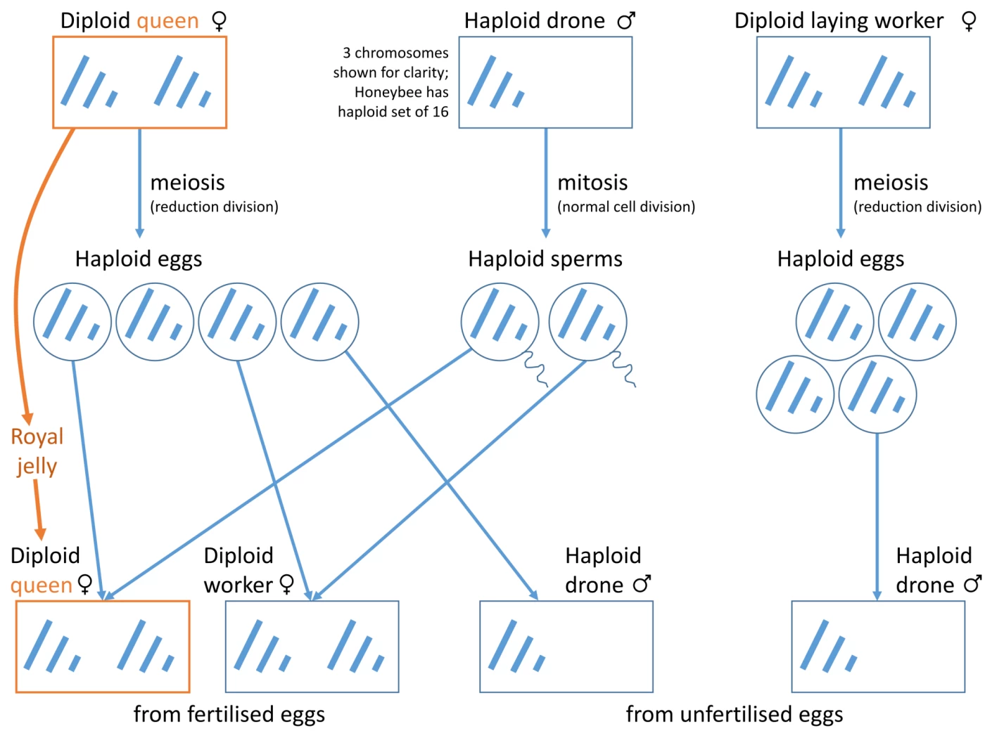 Abb. 6 : Haplo-Diploidie bezeichnet eine Form der Geschlechtsbestimmung, bei der ein Geschlecht nur einen Chromosomensatz trägt (haploid, Drohn) und das andere Geschlecht den doppelten Chromosomensatz (diploid, Königin). In der Regel ist das männliche Geschlecht haploid. |