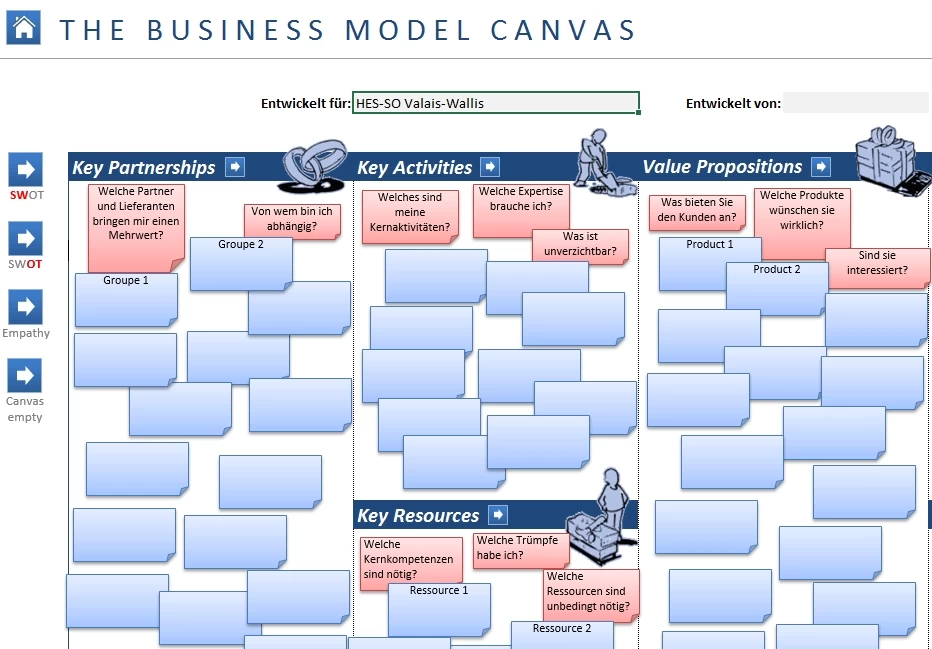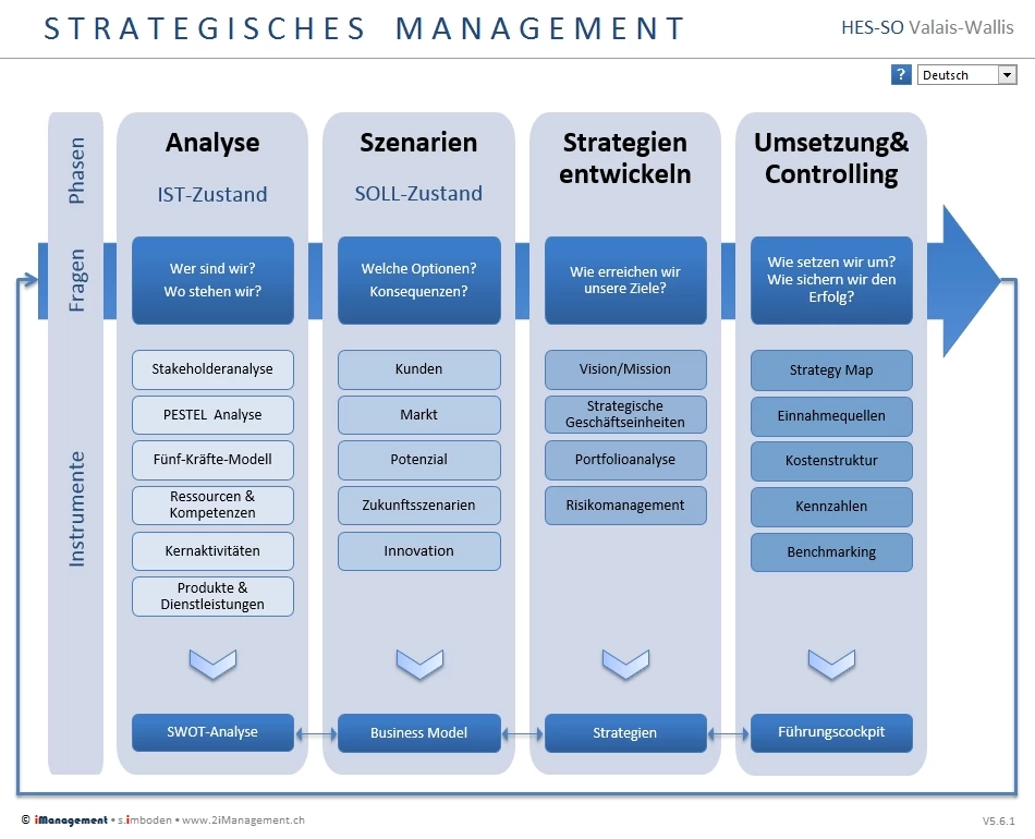 Dieses Tool hilft Ihnen Ihre Strategien zu entwickeln: Im ersten Schritt wird die IST-Situation Ihres Unternehmens analysiert, im zweiten Schritt die SOLL-Situation, im dritten Schritt werden die Vision und Strategien erarbeitet und schliesslich im vierten Schritt wird die Umsetzung und das Controlling aufgebaut. Folgende Elemente sind in diesem Tool implementiert: