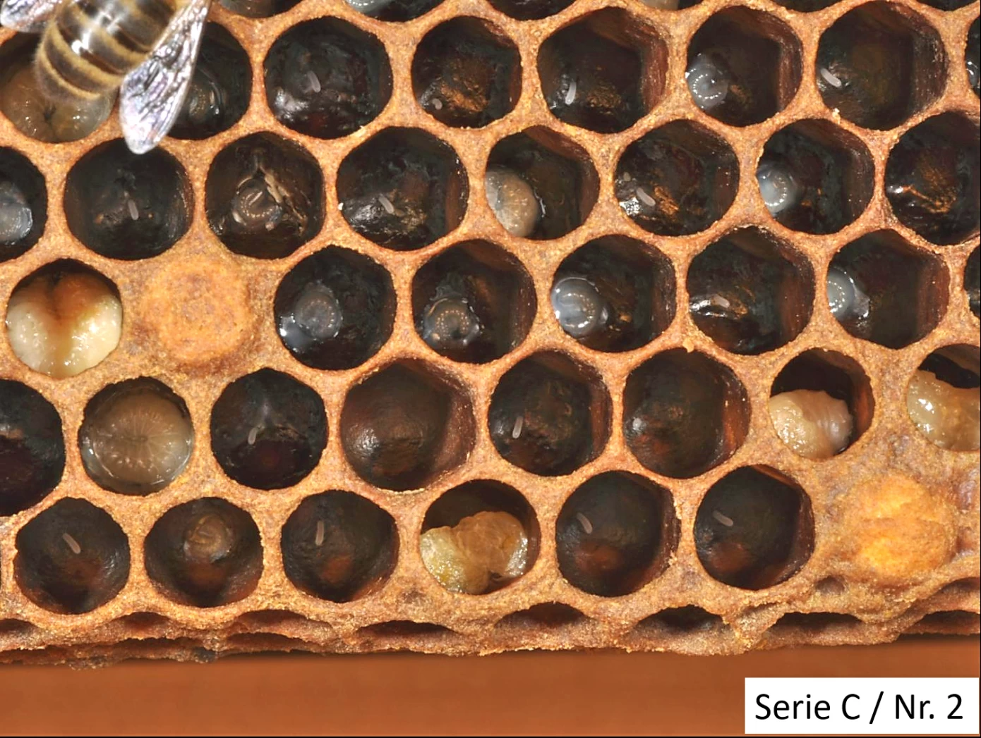 - dark brown to black larval residues (scales) in the cell that can be easily detached from the surface