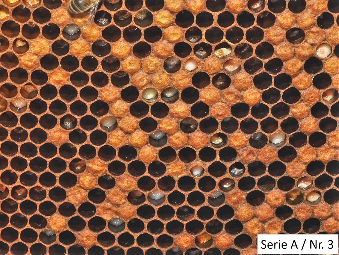 - il arrive que du couvain operculé soit infecté, mais au contraire de la loque américaine, c’est plutôt rare. Les opercules sont dans ce cas aplaties ou enfoncées, parfois perforées ou enlevées, de couleur foncée et fréquemment humide