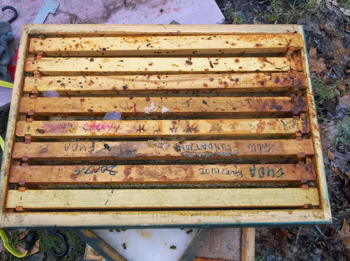 - Taches brunes d’excréments sur la planche d’envol, dans la ruche et sur les cadres.