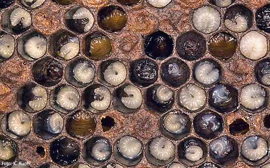 La loque américaine est une maladie bactérienne du couvain très contagieuse qui est désormais présente sur tous les continents. Elle est provoquée par l’agent pathogène Paenibacillus larvae. Elle ne se déclare pas spontanément, mais est imputable à une source d’infection qui doit, si possible, être identifiée pour un contrôle efficace. Selon l’Ordonnance sur les épizooties, les détenteurs-trices sont tenu-e-s d’annoncer non seulement tout cas avéré de loque américaine, mais aussi tout cas suspect à l’inspecteur-trice des ruchers de la région concernée (art. 61 OFE).